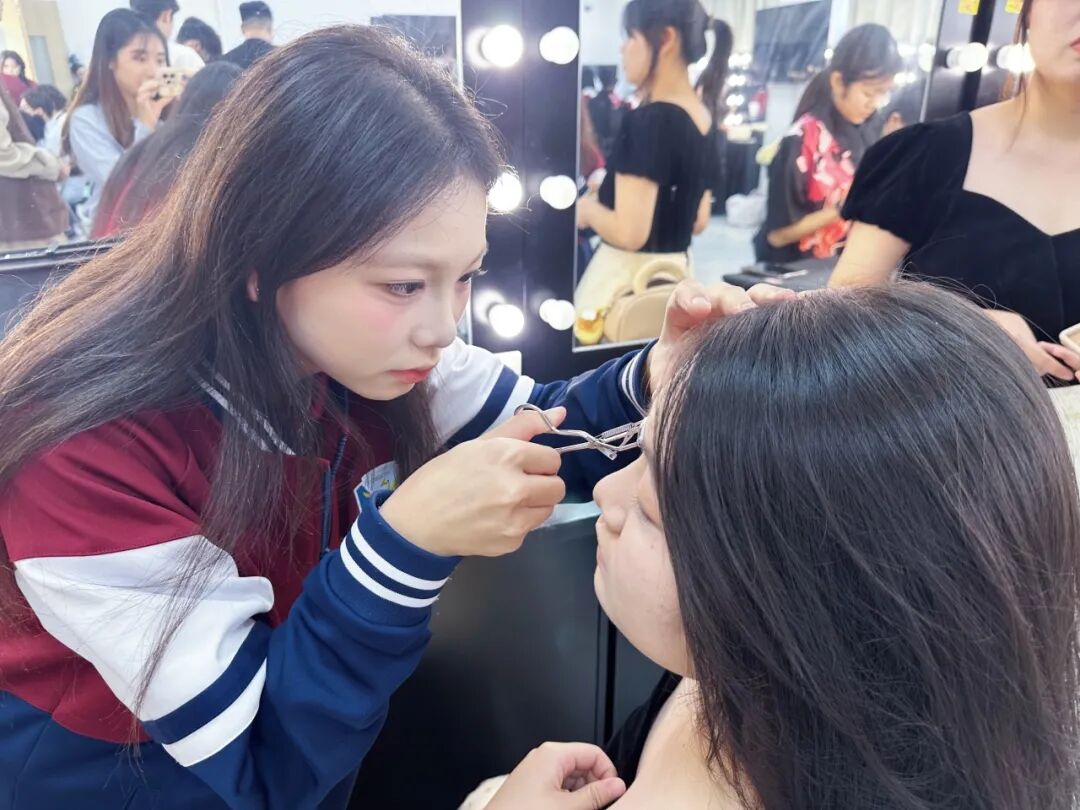 比赛现场,10名参赛学子沉着应战,在规定时间内完成了妆容与发型的全套设计。专业教师全程值守,及时处理突发情况,为选手提供有力支持。学子们紧扣“潮影”主题,将专业技法与潮流审美深度融合,妆容、发型及整体搭配均展现出扎实功底与严谨态度。
