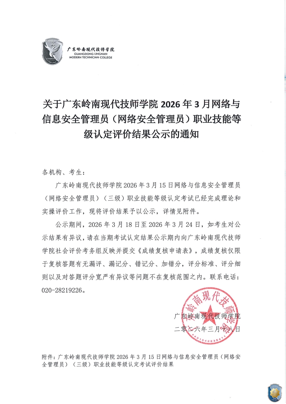 关于广东岭南现代技师学院2026年3月15日网络与信息安全管理员(网络安全管理员)(三级)职业技能等级认定评价结果公示的通知(盖章