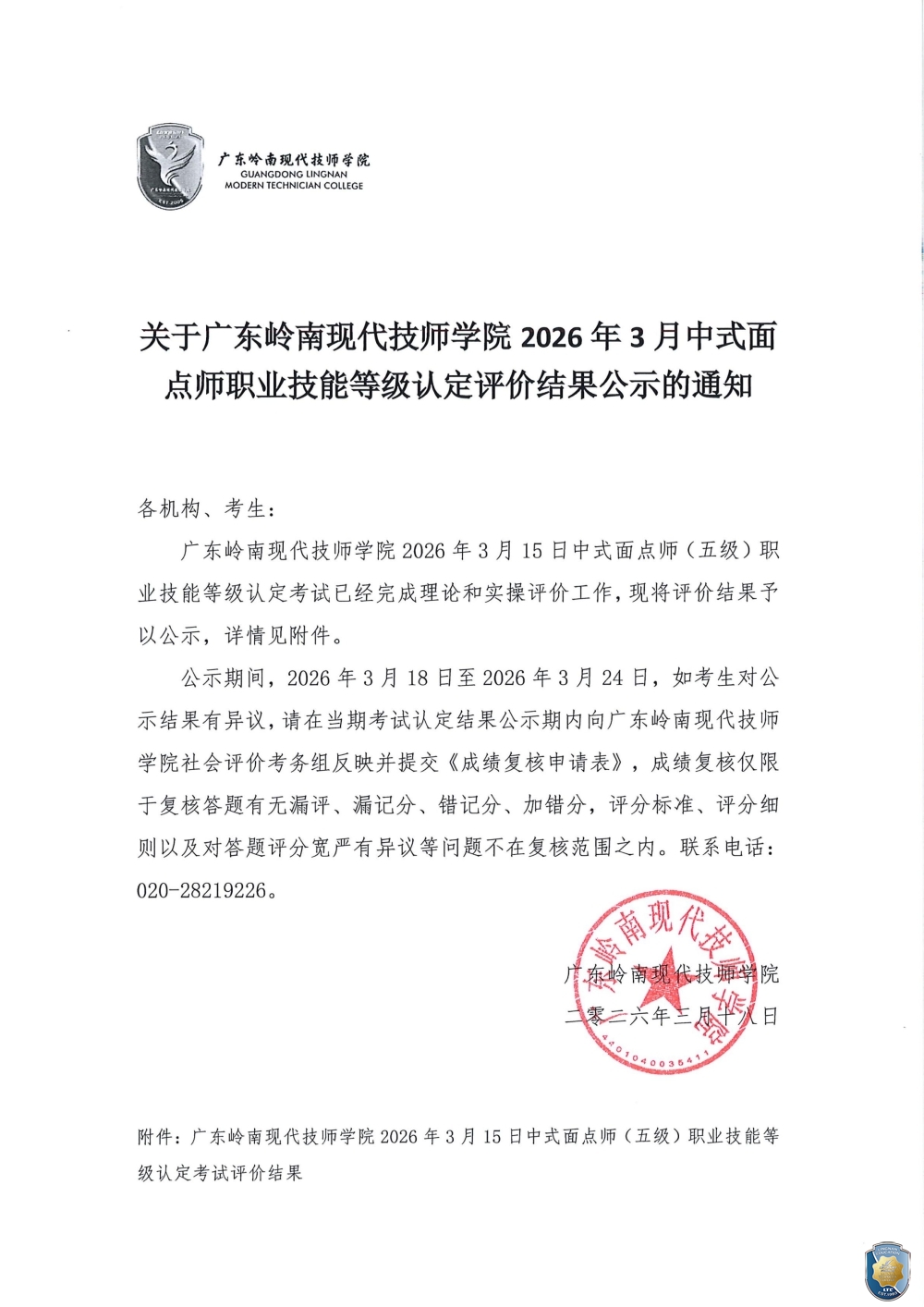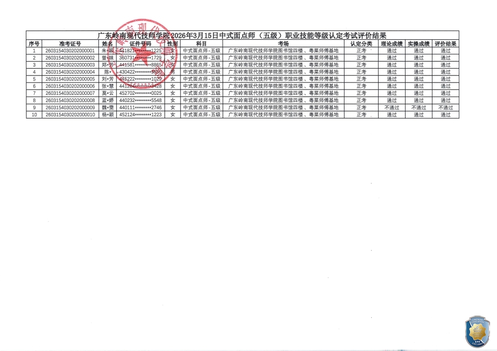 关于广东岭南现代技师学院2026年3月15日中式面点师(五级)职业技能等级认定评价结果公示的通知(盖章